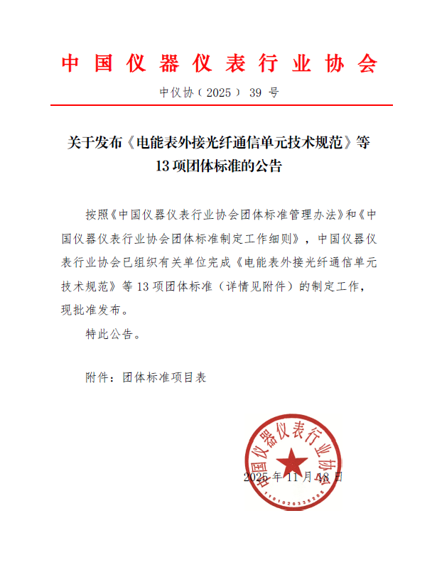 關于發布《電能表外接光纖通信單元技術規范》等13項團體標準的公告