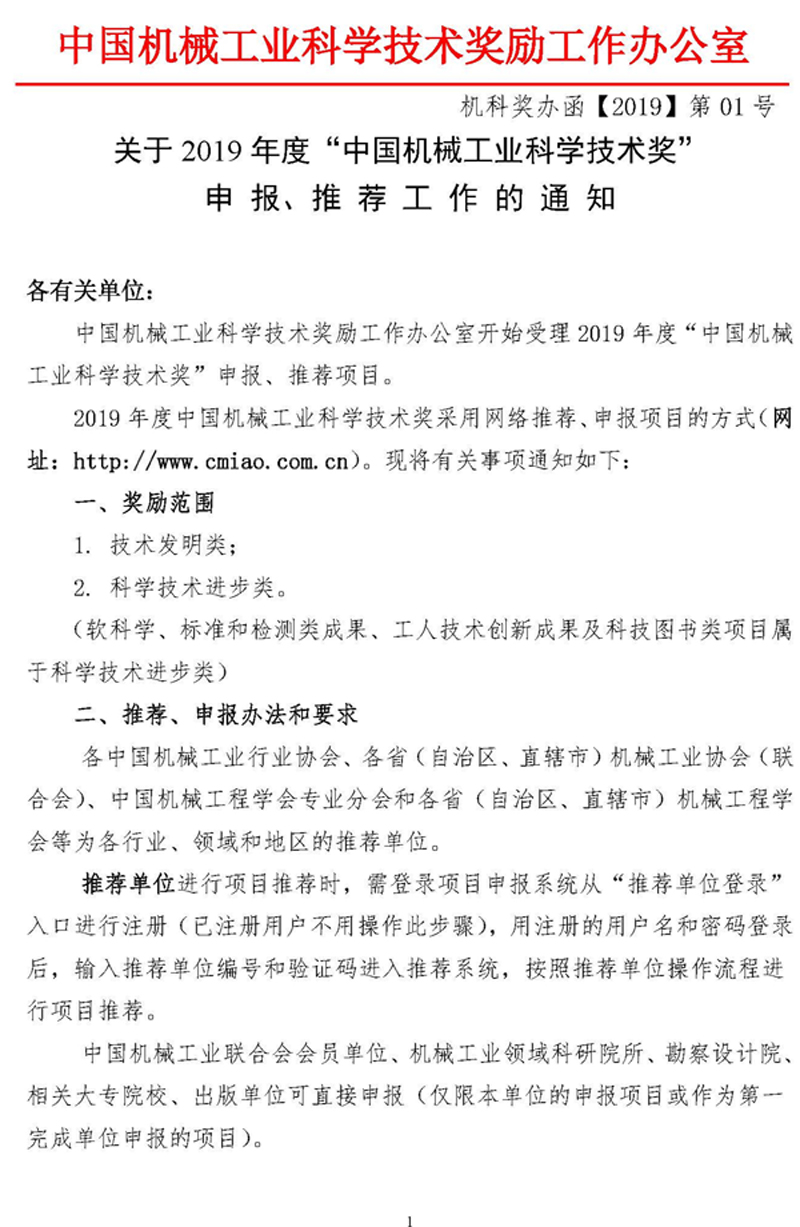 關(guān)于2019年度“中國機(jī)械工業(yè)科學(xué)技術(shù)獎”申報、推