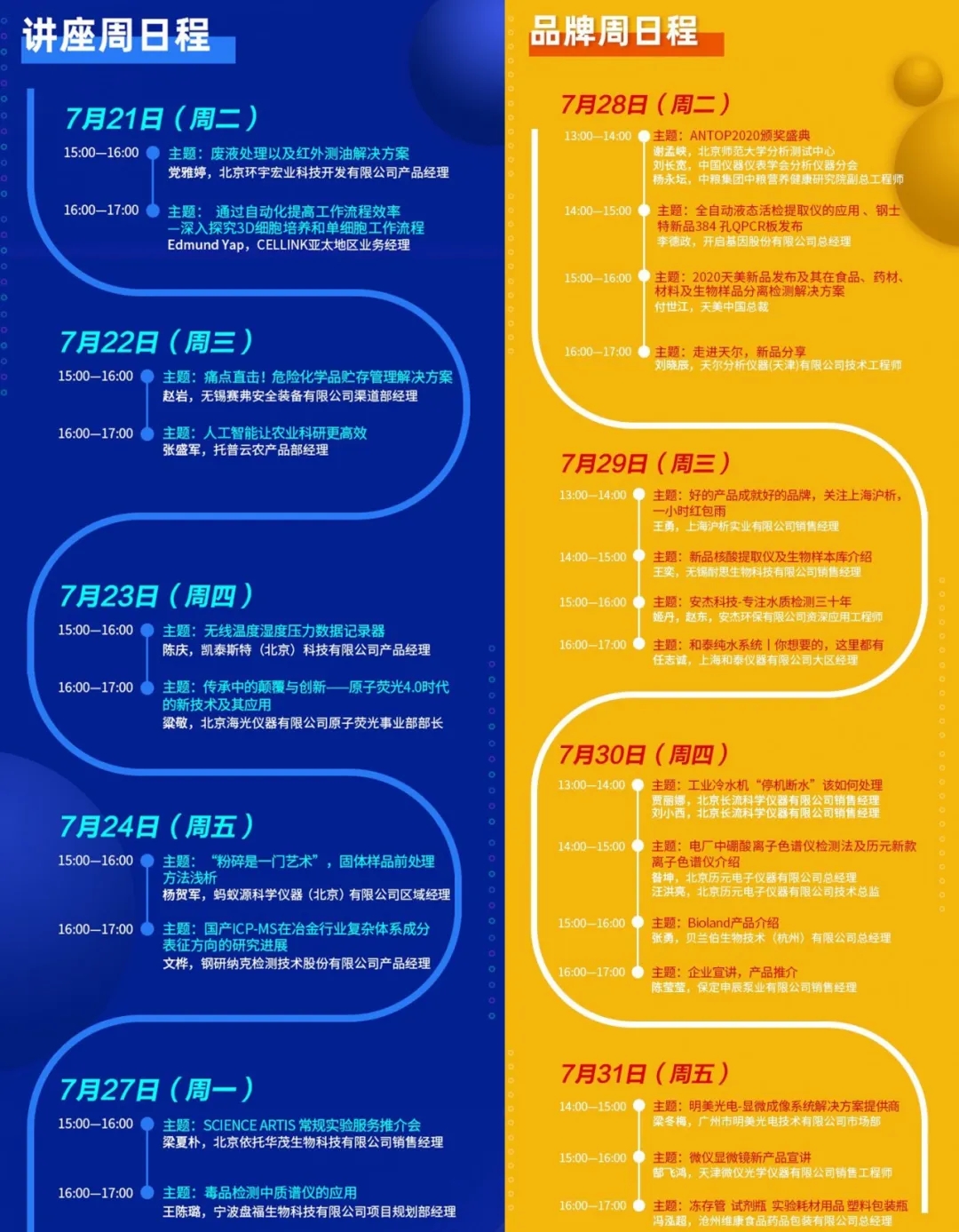 “線上直播”部分,7月21日-31日將有26場次的線上直播,包含了“講座周”、“品牌周”兩大板塊。“講座周”以傳播普及先進(jìn)技術(shù)和經(jīng)驗(yàn)為主要內(nèi)容,“品牌周”以產(chǎn)品推介為主要內(nèi)容。歡迎科學(xué)儀器行業(yè)從業(yè)者于7月20-31日期間,參觀“CISILE線上展覽”,觀看線上直播。