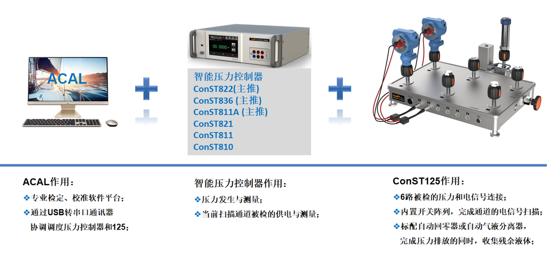 通過該設(shè)備,可配合ConST800系列壓力控制器、ACal檢定/校準系統(tǒng)軟件,構(gòu)成一套多通道全自動壓力檢定/校準系統(tǒng),檢校過程多通道自動切換,自動采集數(shù)據(jù),完成后自動出具證書,滿足用戶的大批量測試需求。