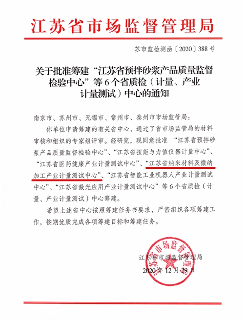 12月29日,江蘇省市場監(jiān)督管理局發(fā)文(蘇市監(jiān)檢測函[2020]388號),同意在蘇州市計量測試院的基礎(chǔ)上籌建江蘇省納米材料及微納加工產(chǎn)業(yè)計量測試中心。