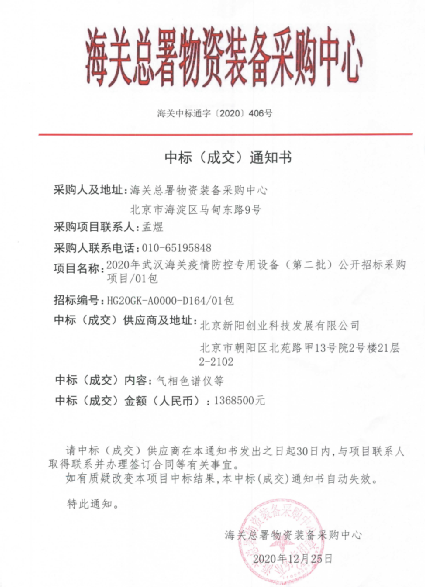 近日,海關總署物資裝備采購中心發布項目中標結果,此次招標為2020年武漢海關疫情防控專用設備(第二批)公開招標采購項目,招標文件編號HG20GK-A0000-D164,招標采購共3包,涉及氣相色譜儀、便攜式核酸檢測箱、熒光定量PCR儀等相關設備,天美公司2臺賽里安456C氣相色譜儀成功入選。