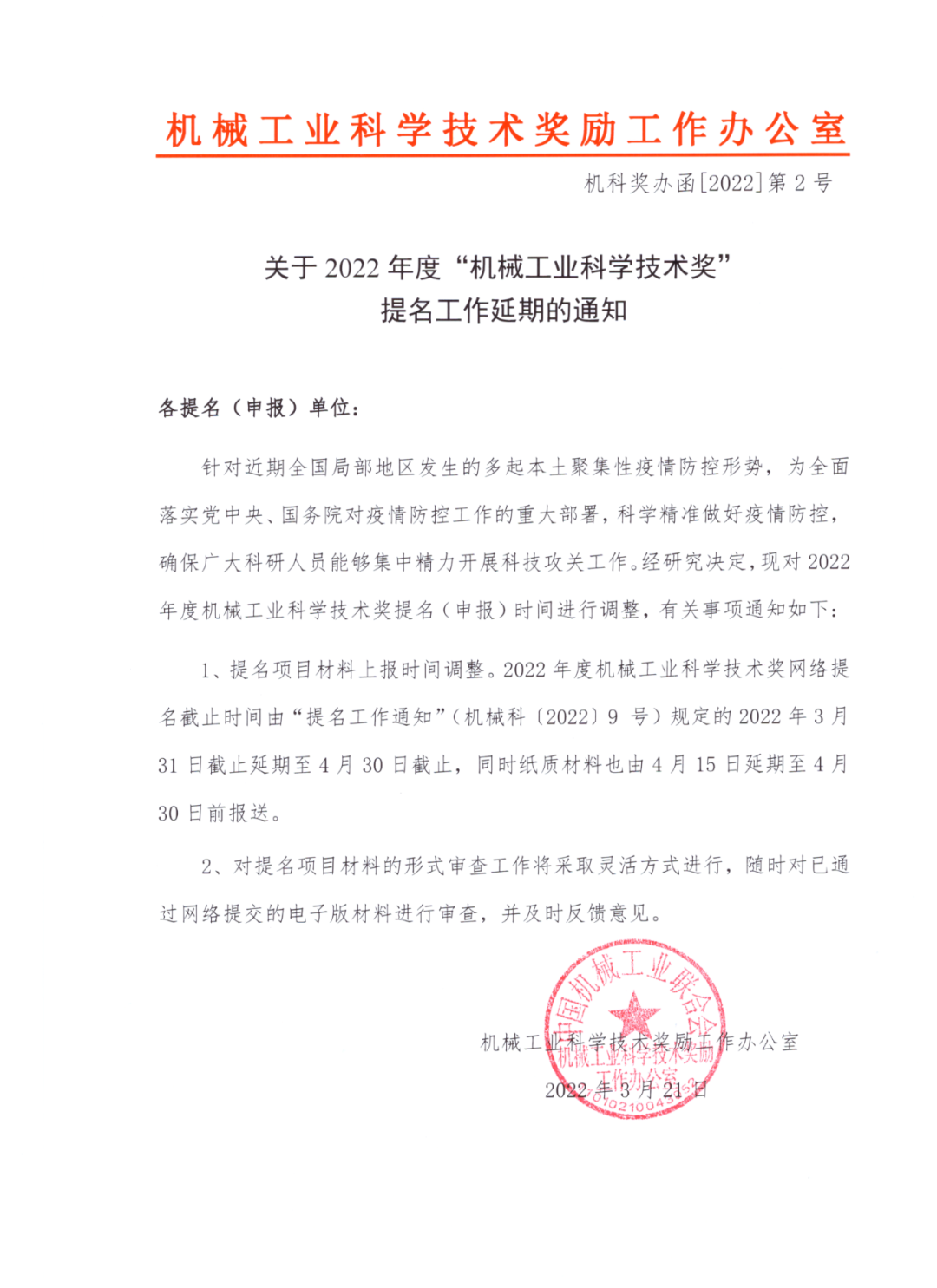 通知下載:關于2022年度“機械工業科學技術獎”提名工作延期的通知