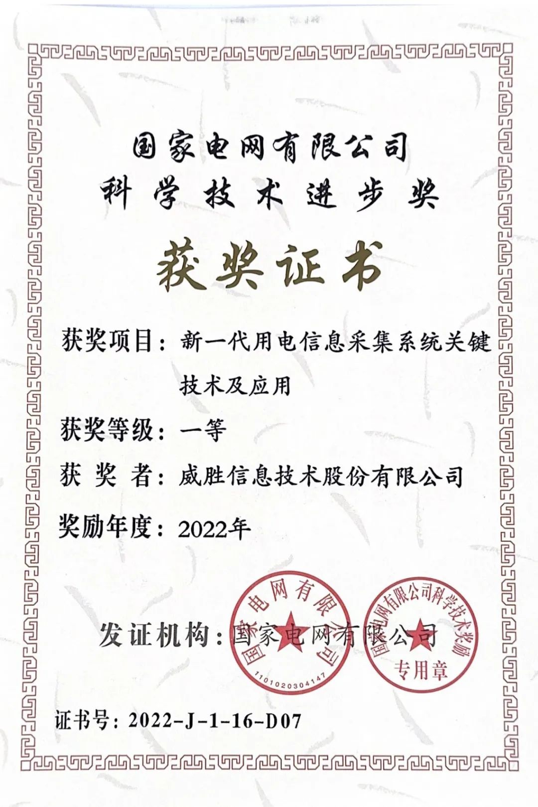 近日,威勝信息參與的“新一代用電信息采集系統(tǒng)關鍵技術及應用”項目獲得國家電網有限公司2022年度科學技術進步一等獎。