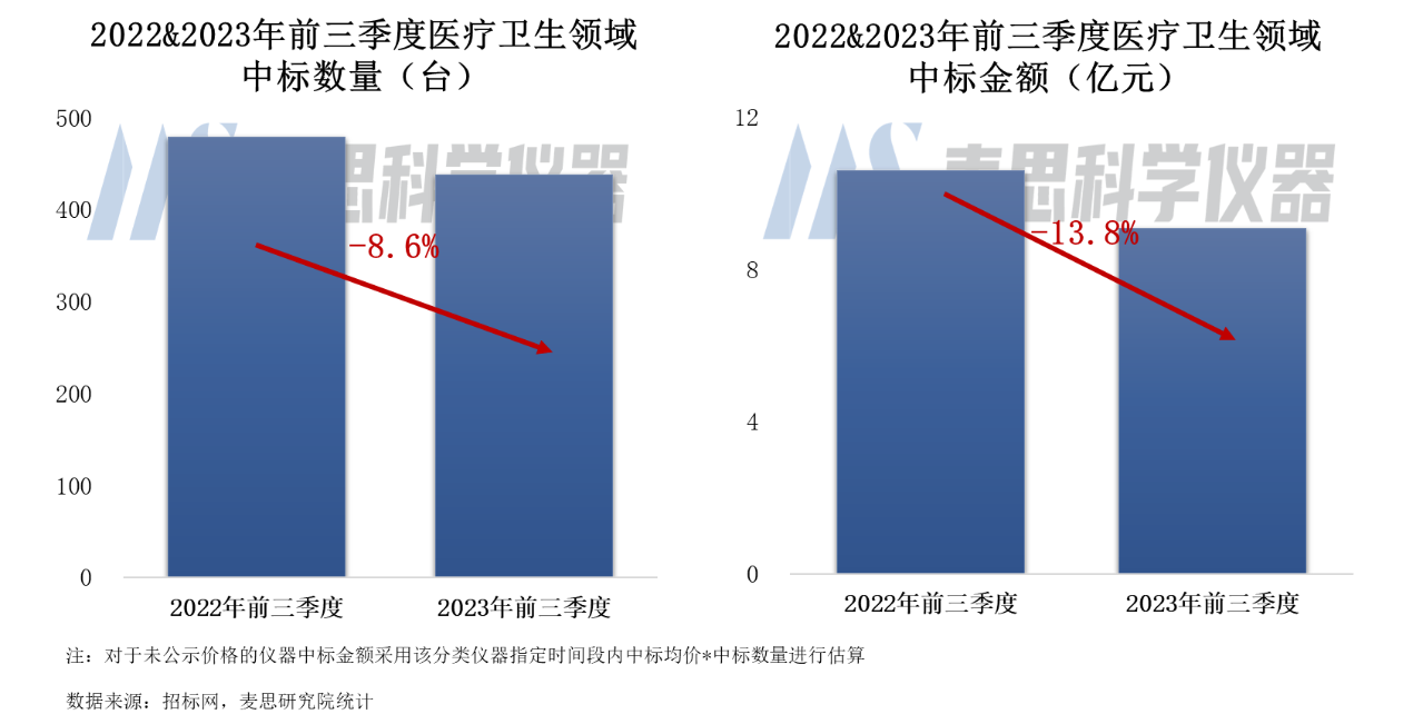 2023年前三季度質(zhì)譜儀器在醫(yī)療衛(wèi)生領(lǐng)域的中標數(shù)量達到438臺,同比下降8.6%。中標市場規(guī)模約9.1億,同比下降13.8%。