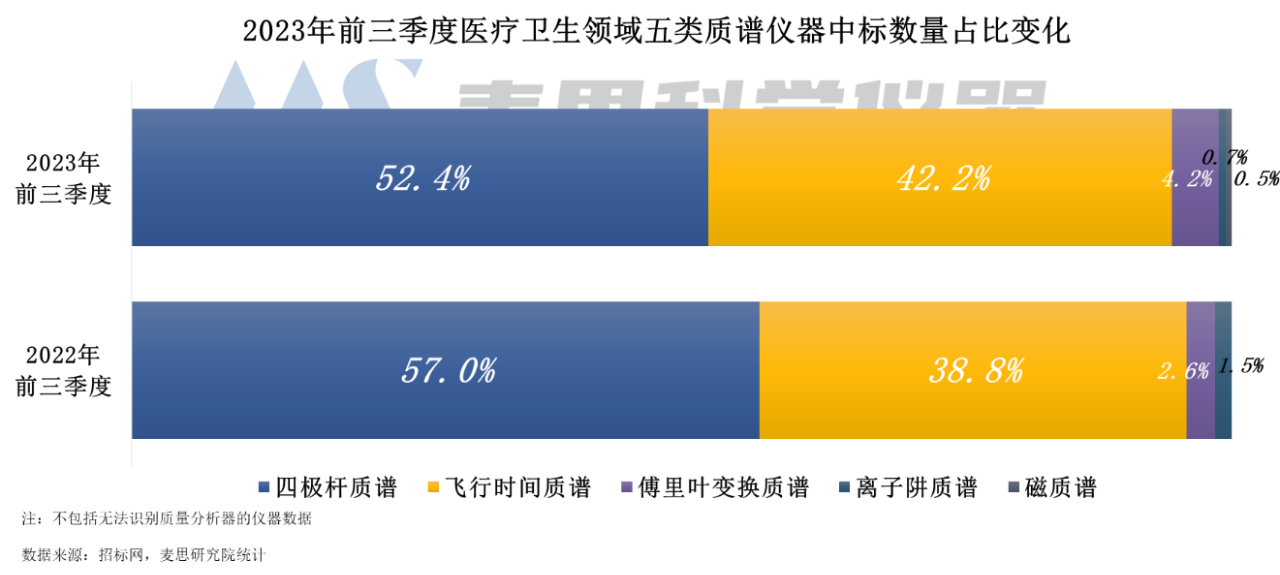 從各技術(shù)路線看,2023年前三季度醫(yī)療衛(wèi)生領(lǐng)域中標質(zhì)譜主要為四極桿質(zhì)譜和飛行時間質(zhì)譜,合計占比高達95%。其中四極桿質(zhì)譜中標數(shù)量最多,占比52.4%,但同比減少4.6個百分點;其次是飛行時間質(zhì)譜,占比42.2%,同比增加3.4個百分點;傅里葉變換質(zhì)譜占比4.2%,同比增加1.6個百分點。離子阱質(zhì)譜、磁質(zhì)譜中標數(shù)量極少。