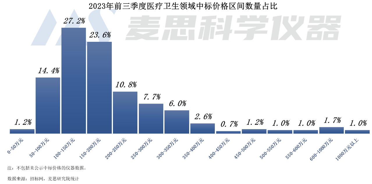 從各價格區(qū)間的中標數(shù)量占比來看,醫(yī)療衛(wèi)生領(lǐng)域質(zhì)譜儀器中標單價基本在50-350萬元之間,占比約90%。其中,單價在100-150萬元以內(nèi)的質(zhì)譜儀器數(shù)量最多,2023年前三季度中標數(shù)量占比約27.2%。