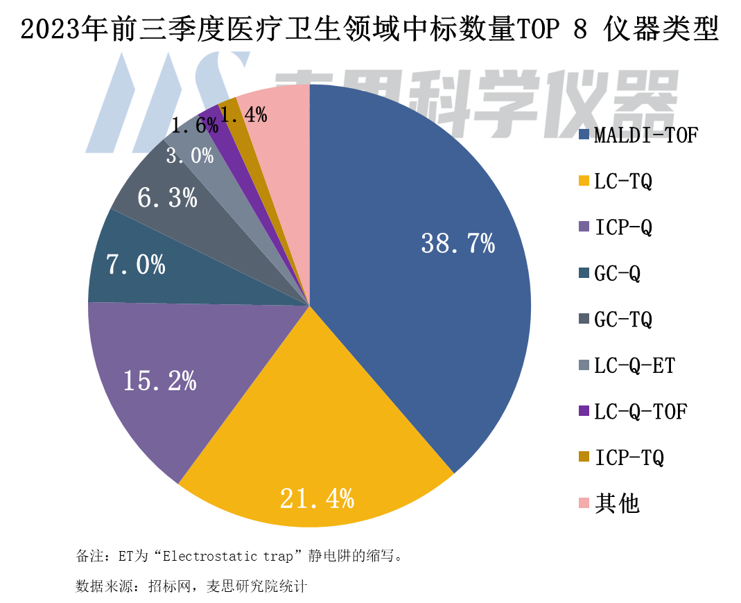2023年前三季度中標數(shù)量Top 8儀器類型分別為MALDI-TOF、LC-TQ、ICP-Q、GC-Q、GC-TQ、LC-Q-ET、LC-Q-TOF和ICP-TQ,中標數(shù)量合計占比約95%。其中MALDI-TOF和LC-TQ是主流產(chǎn)品,占比超60%。