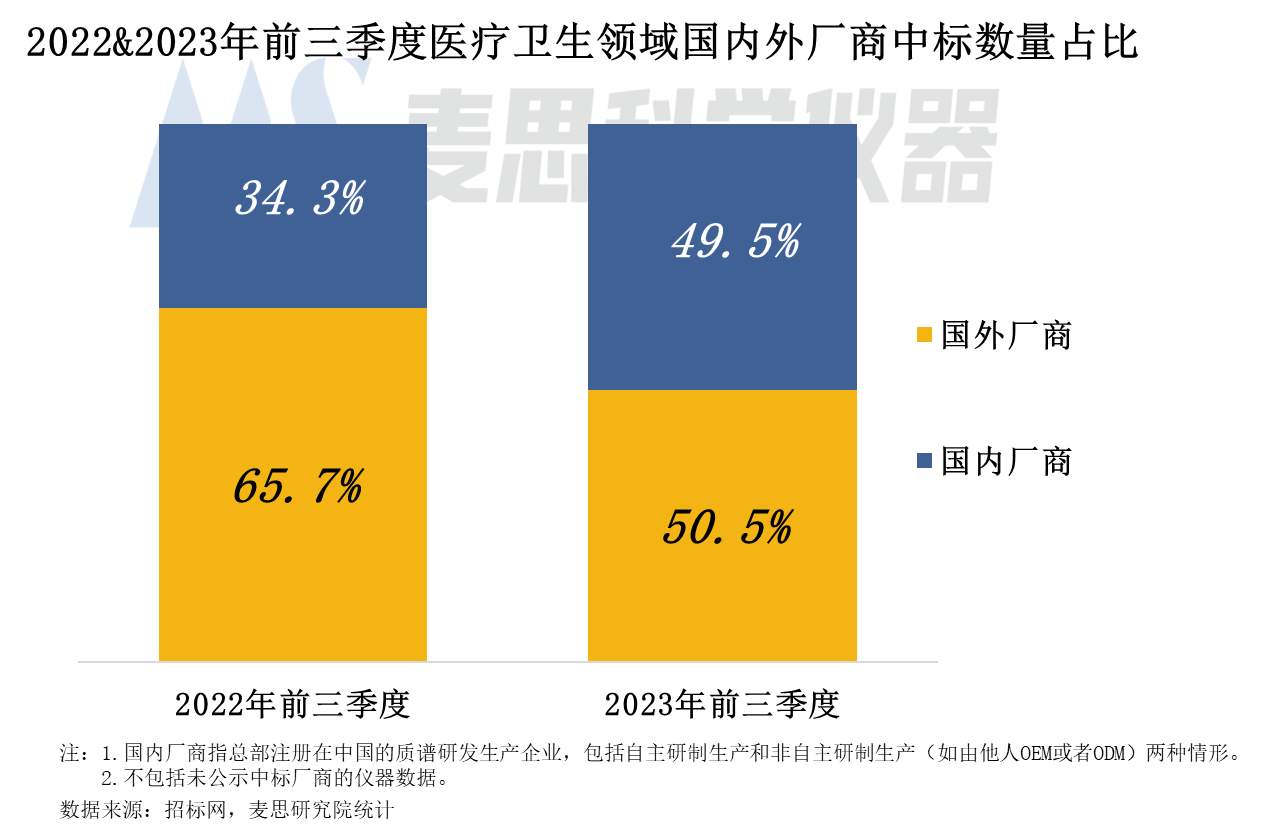質(zhì)譜儀器中標數(shù)量國產(chǎn)化率較高,與國外廠商中標數(shù)量占比僅有1個百分點的差距。與2022年同期對比,2023年前三季度國內(nèi)廠商在醫(yī)療衛(wèi)生領(lǐng)域的中標數(shù)量占比增長顯著,從34.3%增加至49.5%,增幅15個百分點。