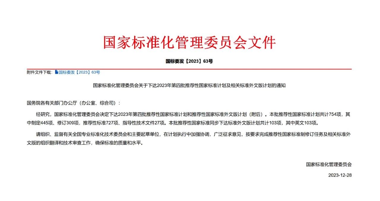 2023年12月28日,國家標(biāo)準(zhǔn)化管理委員會(huì)決定下達(dá)2023年第四批推薦性國家標(biāo)準(zhǔn)計(jì)劃和推薦性國家標(biāo)準(zhǔn)外文版計(jì)劃。