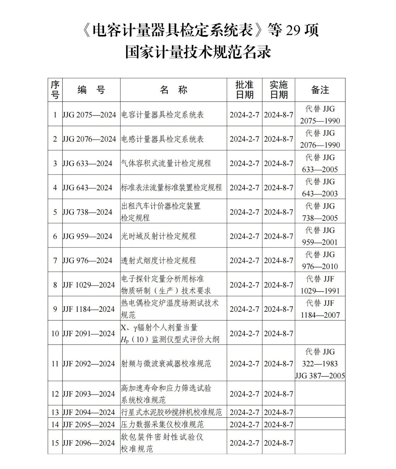 根據《中華人民共和國計量法》有關規定,批準《電容計量器具檢定系統表》等29項國家計量技術規范發布實施,現予公告。