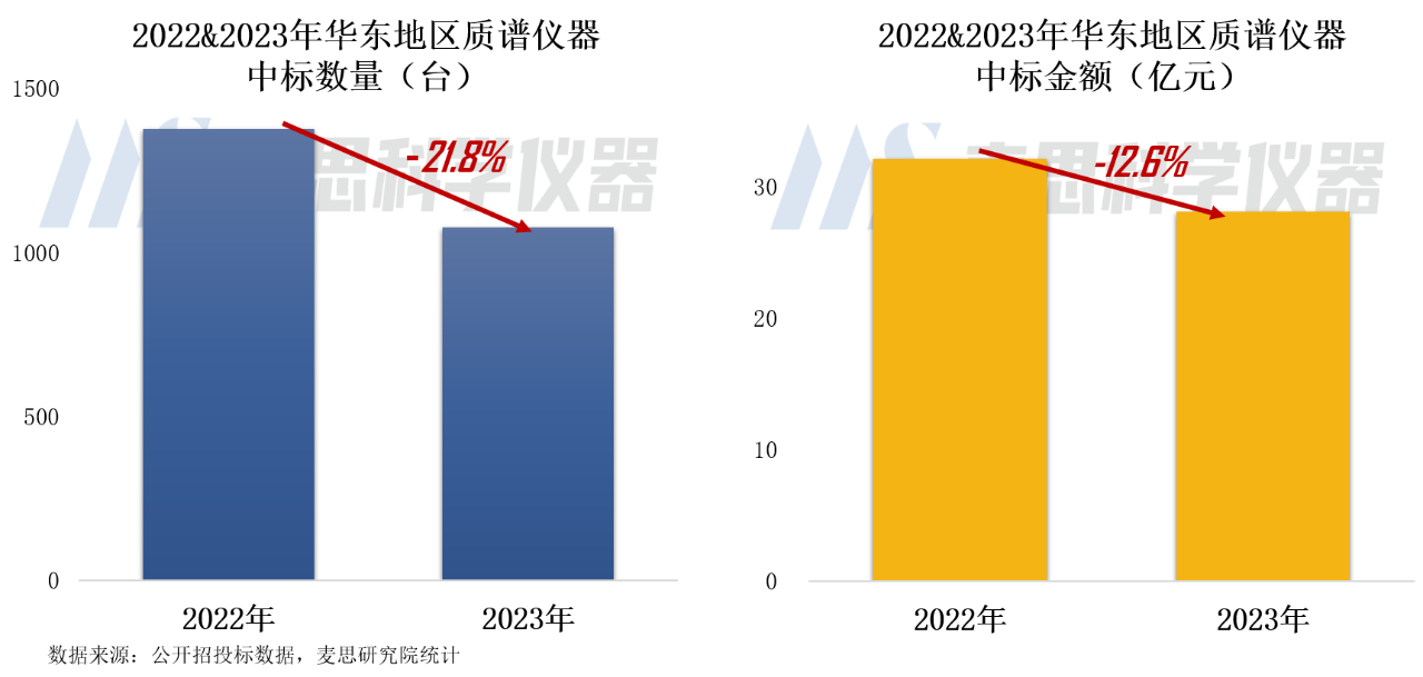 2023年華東地區質譜儀器中標數量約1100臺,同比減少21.8%。中標金額約28億元,同比減少12.6%,降幅小于全國平均值。中標數量和金額在全國市場的占比分別為36.5%和41.5%。