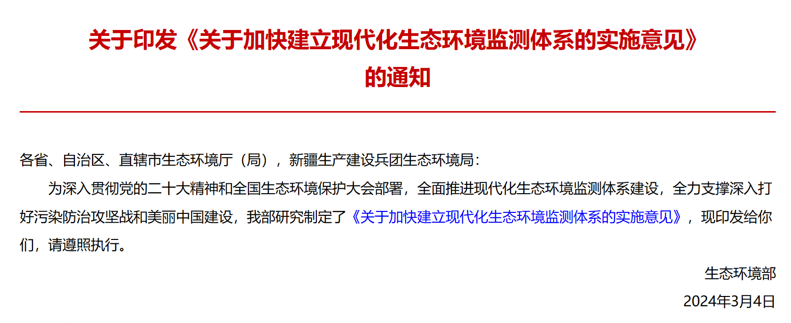 近日,生態(tài)環(huán)境部印發(fā)《關(guān)于加快建立現(xiàn)代化生態(tài)環(huán)境監(jiān)測(cè)體系的實(shí)施意見》(簡稱《意見》)。這一實(shí)施意見旨在深入貫徹黨的二十大精神和全國生態(tài)環(huán)境保護(hù)大會(huì)部署,加快建立現(xiàn)代化生態(tài)環(huán)境監(jiān)測(cè)體系,全力支撐深入打好污染防治攻堅(jiān)戰(zhàn)和美麗中國建設(shè),以適應(yīng)生態(tài)文明建設(shè)和生態(tài)環(huán)境保護(hù)的新要求。