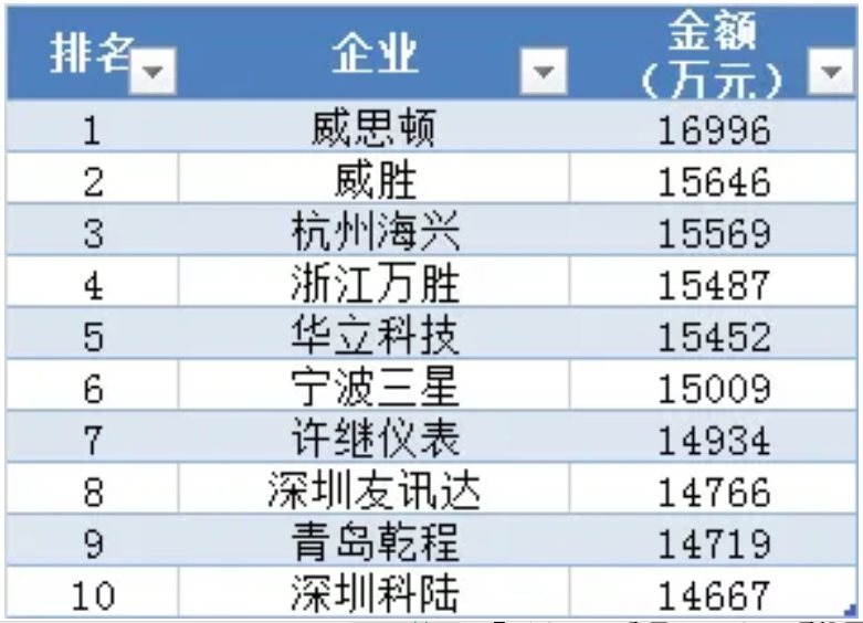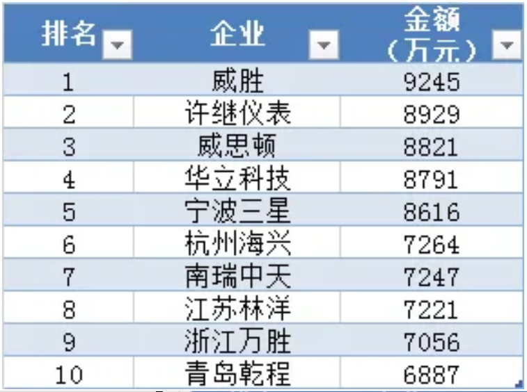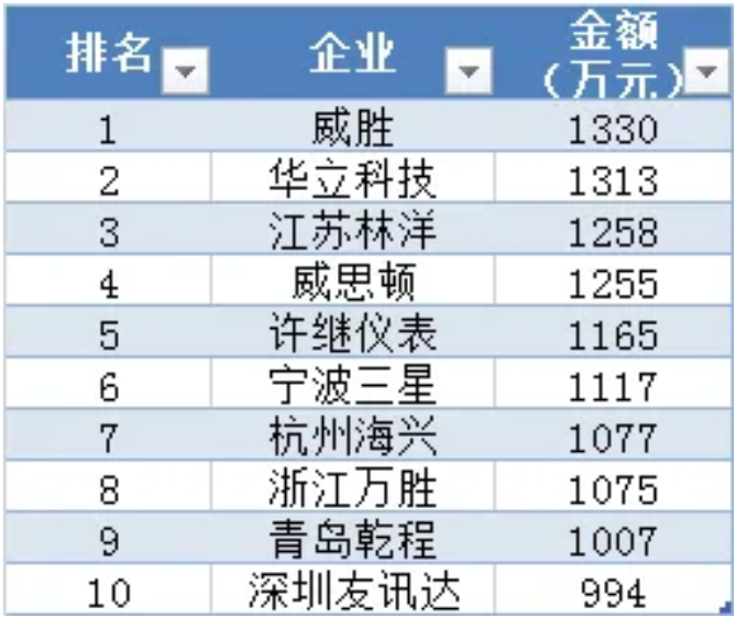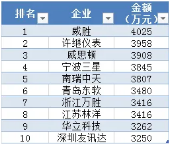 本批次總計有81家企業(yè)實現(xiàn)中標,中標金額前五名企業(yè)為威勝(威勝集團+威勝信息)、煙臺東方威思頓電氣有限公司、寧波三星醫(yī)療電氣股份有限公司、河南許繼儀表有限公司、江蘇林洋能源股份有限公司。
