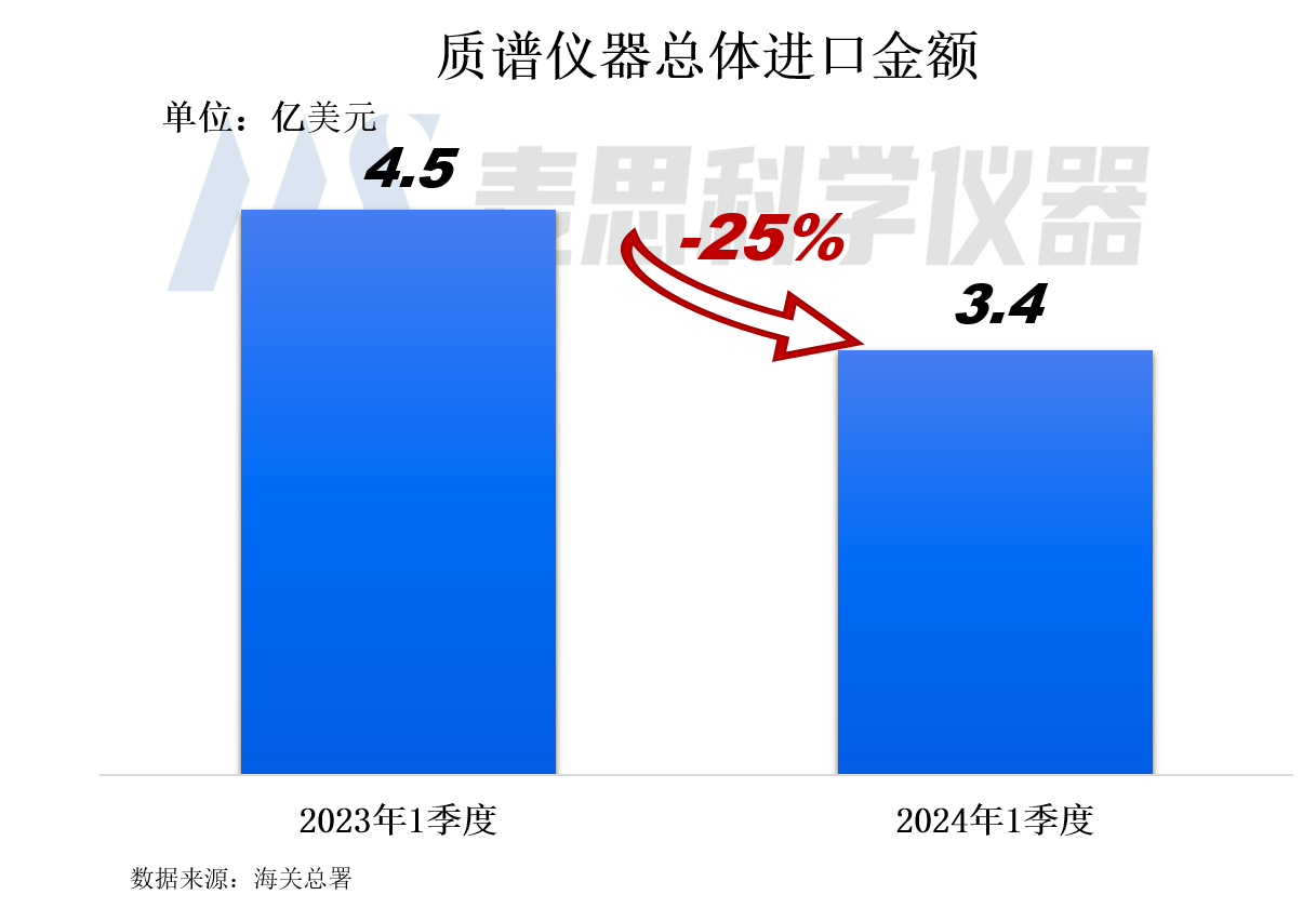 2024年1季度我國質(zhì)譜儀器(含質(zhì)譜聯(lián)用儀和其他質(zhì)譜儀)進(jìn)口金額為3.4億美元(約合人民幣24億元),同比下降25%,這是2021年以來同期進(jìn)口額首次出現(xiàn)下滑。