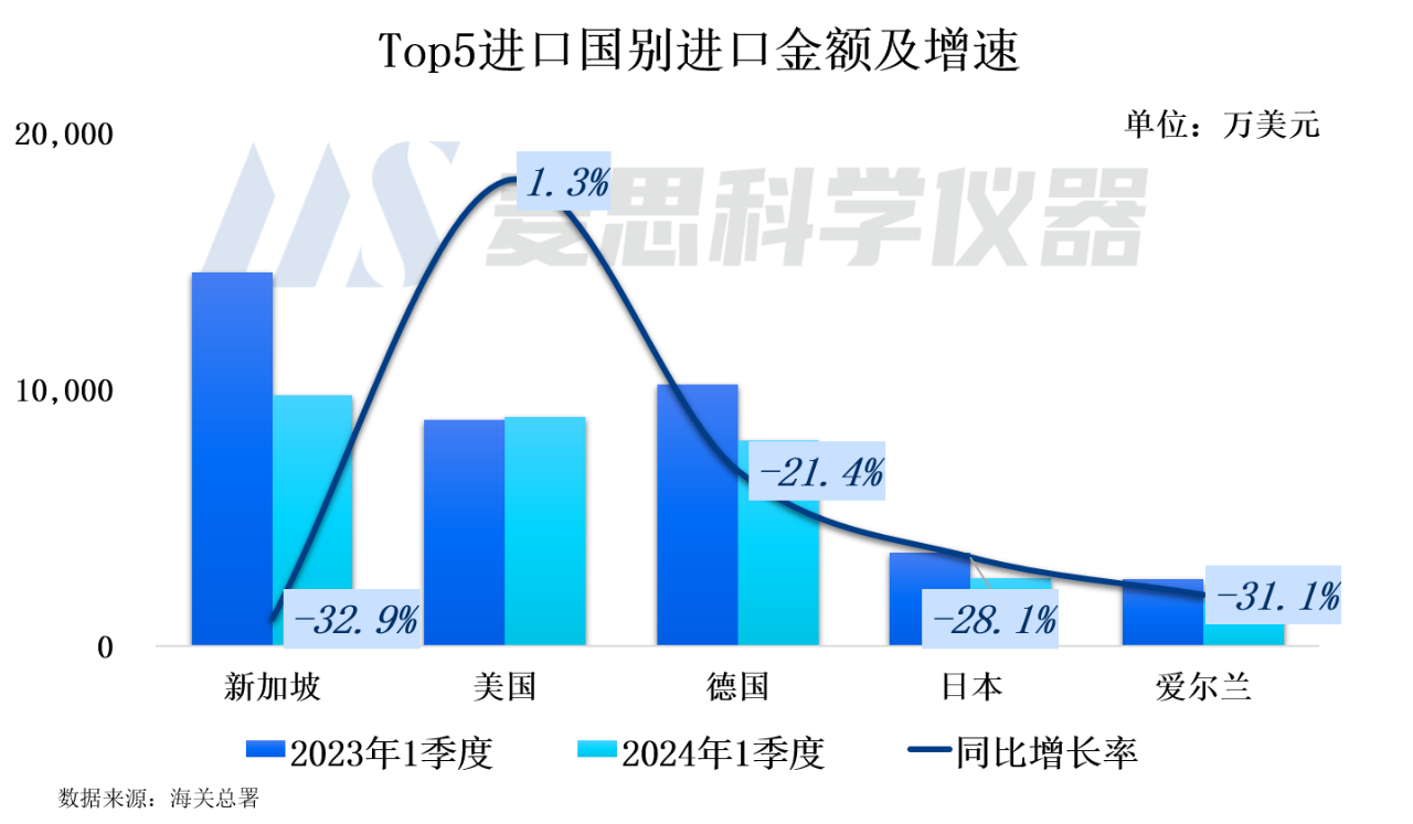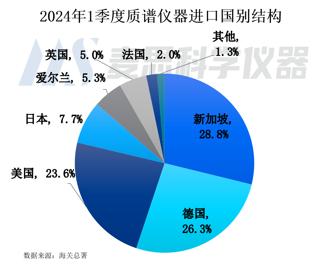 從2024年1季度質(zhì)譜儀器進(jìn)口國別結(jié)構(gòu)看,排名前五位為新加坡、德國、美國、日本以及愛爾蘭,進(jìn)口金額占比分別為28.8%、26.3%、23.6%、7.7%以及5.3%。