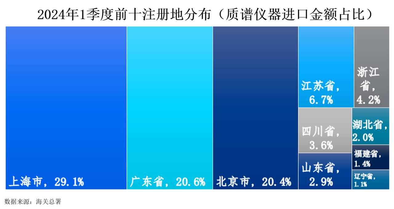 2024年1季度,中國質(zhì)譜儀器進(jìn)口額最高的注冊地依次為上海市、廣東省和北京市,分別以29.1%、20.6%和20.4%的占比位居前三。緊隨其后的是江蘇省和浙江省,占比分別為6.7%和4.2%。四川省、山東省、湖北省、福建省以及遼寧省的進(jìn)口額占比分別為3.6%、2.9%、2.0%、1.4%和1.1%。