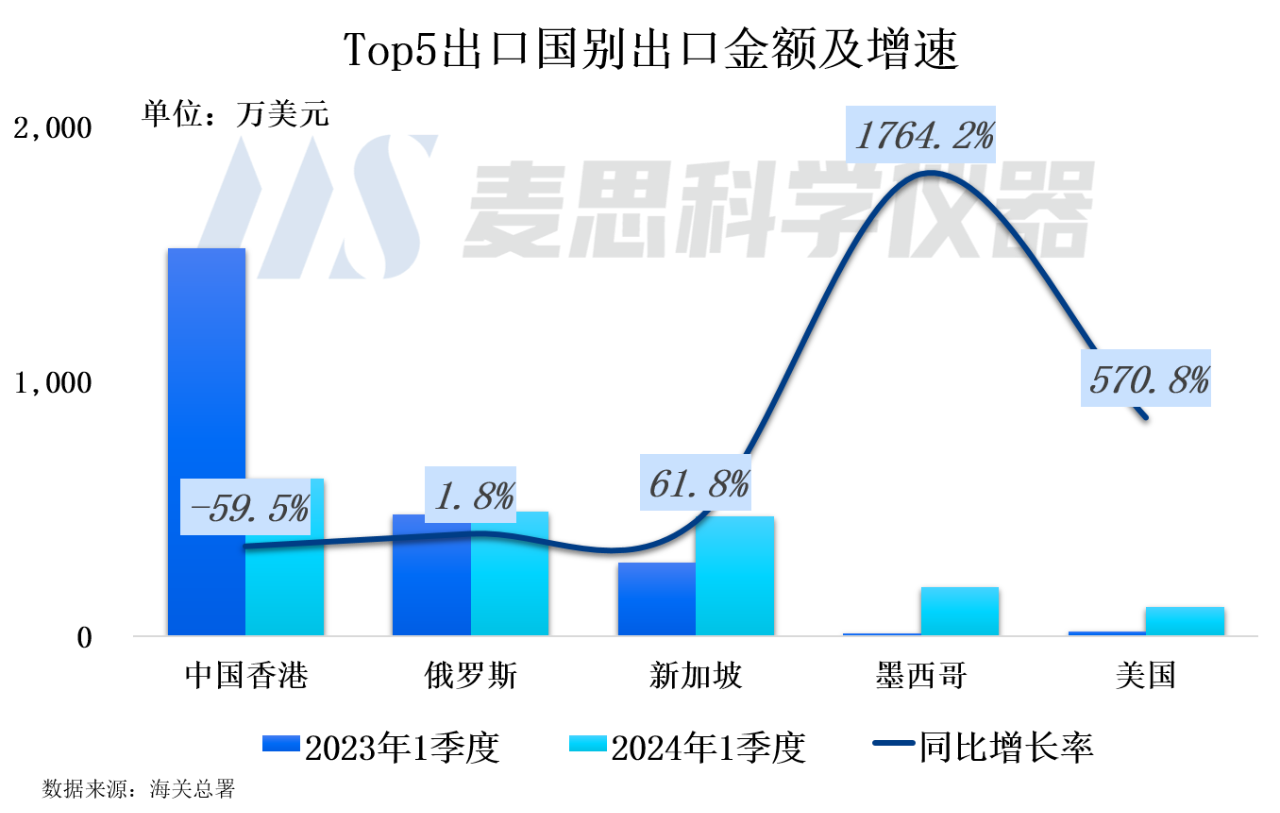 中國質(zhì)譜儀器的出口主要集中在“其他質(zhì)譜儀器”類別,2024年1季度出口額為1800萬美元,同比下降了25%。與此同時(shí),質(zhì)譜聯(lián)用儀的出口額約為500萬美元,與去年同期相比增長了84%,盡管增速顯著,但由于其基數(shù)較小,實(shí)際增長額僅為240萬美元。