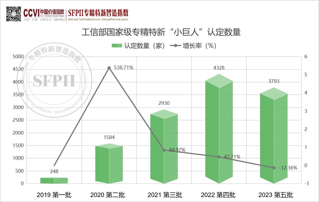 據(jù)SFPII專精特新智造指數(shù)跟蹤顯示,2023年工信部第五批國家級專精特新“小巨人”企業(yè)認定共計3793家,該批申請數(shù)量創(chuàng)歷史新高,合計約17000家,但是通過率創(chuàng)歷史新低,約22.3%。截至2023年底,全國共有12756家“專精特新”小巨人企業(yè),提前并超額完成了“到2025年,培育1萬家國家級專精特新‘小巨人’企業(yè)”的目標”。
