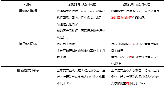 2021 VS 2023專精特新“小巨人” 企業(yè)認定標準變化對比