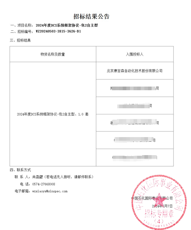 5月7日,北京康吉森自動化技術(shù)股份有限公司(下稱”康吉森“)以第一名的成績成功中標中國石油化工集團有限公司(下稱”中石化“)2024年度DCS國產(chǎn)化系統(tǒng)框架協(xié)議,成為在此標段時間范圍內(nèi)的首選供應(yīng)商!此次中標不僅展現(xiàn)了康吉森在DCS領(lǐng)域的技術(shù)實力和創(chuàng)新能力,也彰顯了中石化對控制系統(tǒng)國產(chǎn)化升級及自主可控戰(zhàn)略要求的高度重視。