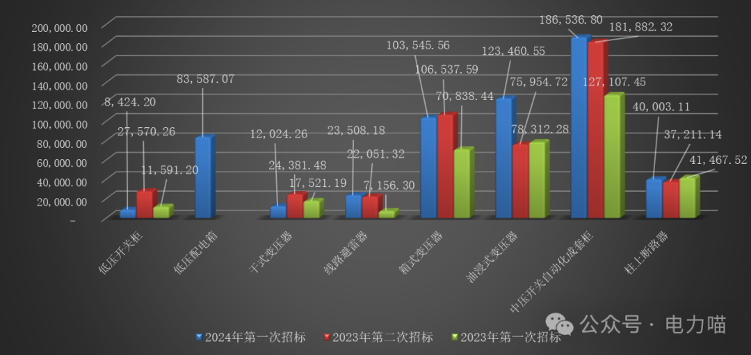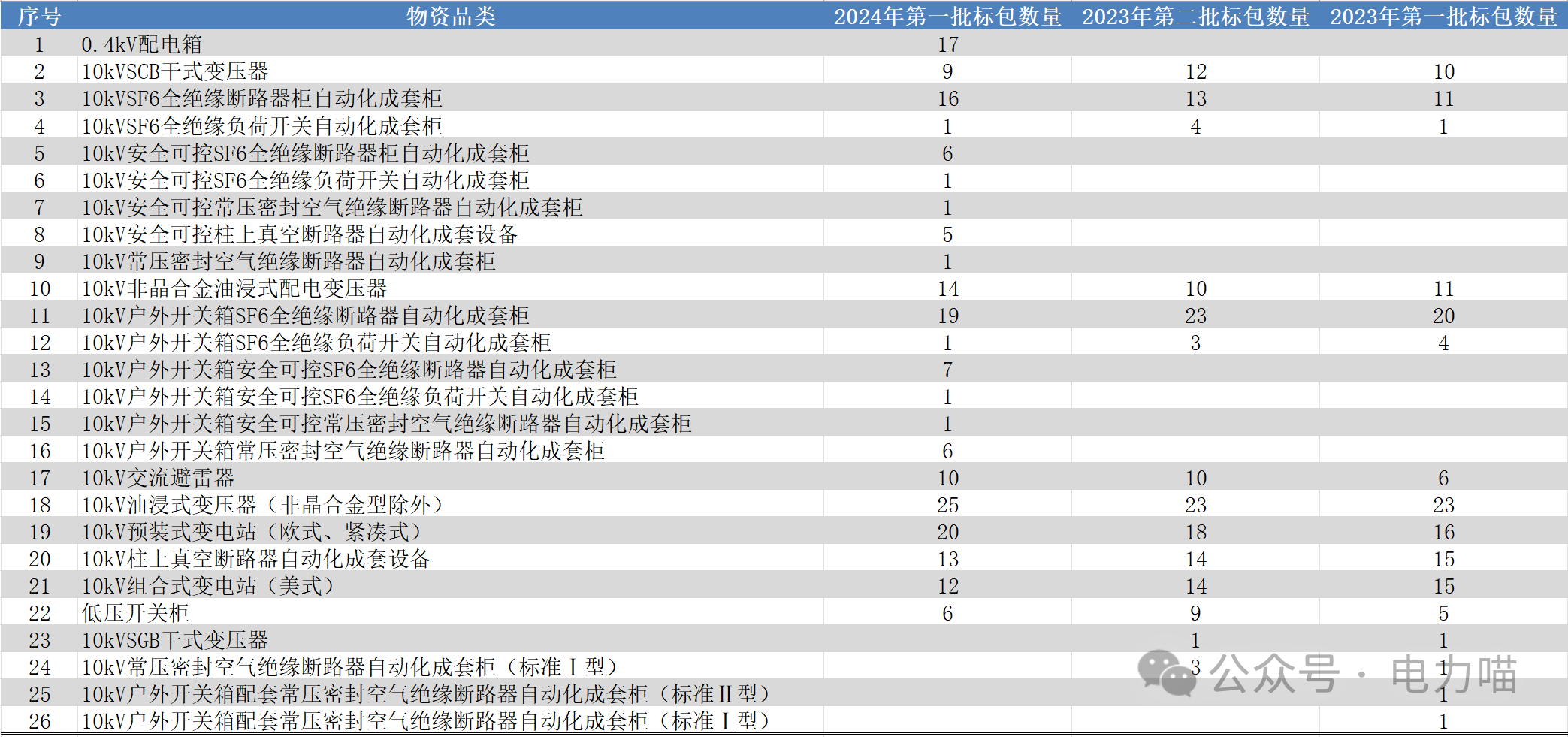 根據(jù)物資目錄分類規(guī)則,配電設(shè)備招標(biāo)的三級物資名稱包括低壓開關(guān)柜、低壓配電箱、干式變壓器、線路避雷器、箱式變壓器、油浸式變壓器、中壓開關(guān)自動(dòng)化成套柜、柱上斷路器共八種。