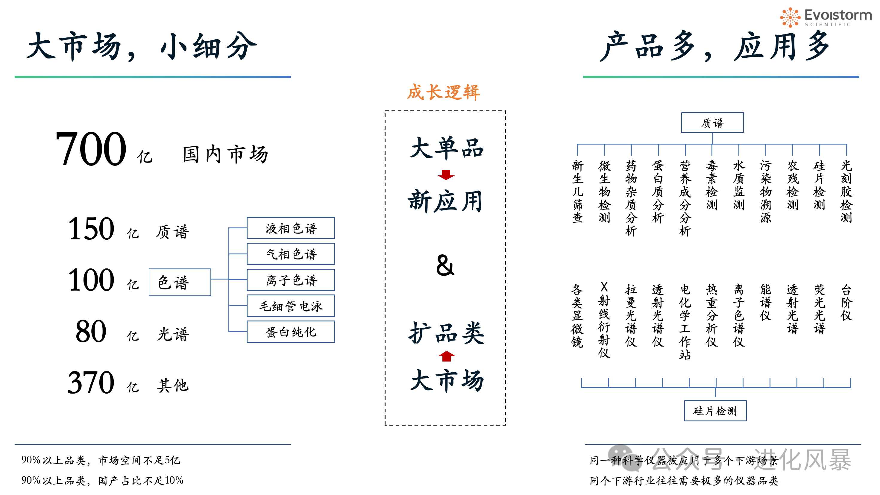 (2)如果你跟絕大多數(shù)儀器公司一樣,在一個細(xì)分品類眾多的市場,那么你成長的可選路徑很有可能是“解決方案”,即圍繞某一類客戶的需求(例如環(huán)境監(jiān)測、細(xì)胞學(xué)、半導(dǎo)體檢測、新能源檢測)不斷開發(fā)實(shí)驗(yàn)上下游的細(xì)分產(chǎn)品。