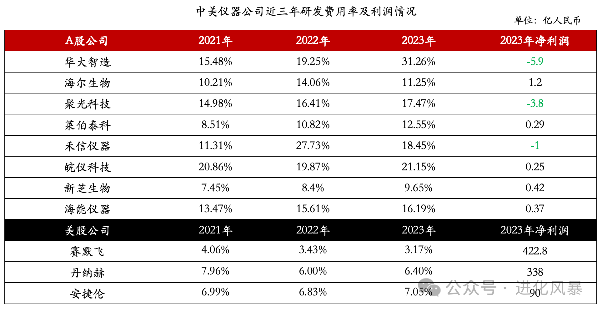 為了解決技術(shù)遷移難的問題,我們觀察到很多儀器公司在上市/融資后利用募集資金開始大量擴(kuò)充產(chǎn)品品類,廣招研發(fā)人員,廣開研發(fā)管線,以至于研發(fā)費(fèi)用飆升,給公司經(jīng)營業(yè)績(凈利潤和現(xiàn)金流)造成沉重的負(fù)擔(dān)。而同期海外巨頭的研發(fā)費(fèi)用率持續(xù)保持在10%以內(nèi),賽默飛甚至將研發(fā)費(fèi)用率控制在5%以下(刨除服務(wù)、經(jīng)銷類產(chǎn)品后,約8~10%)。