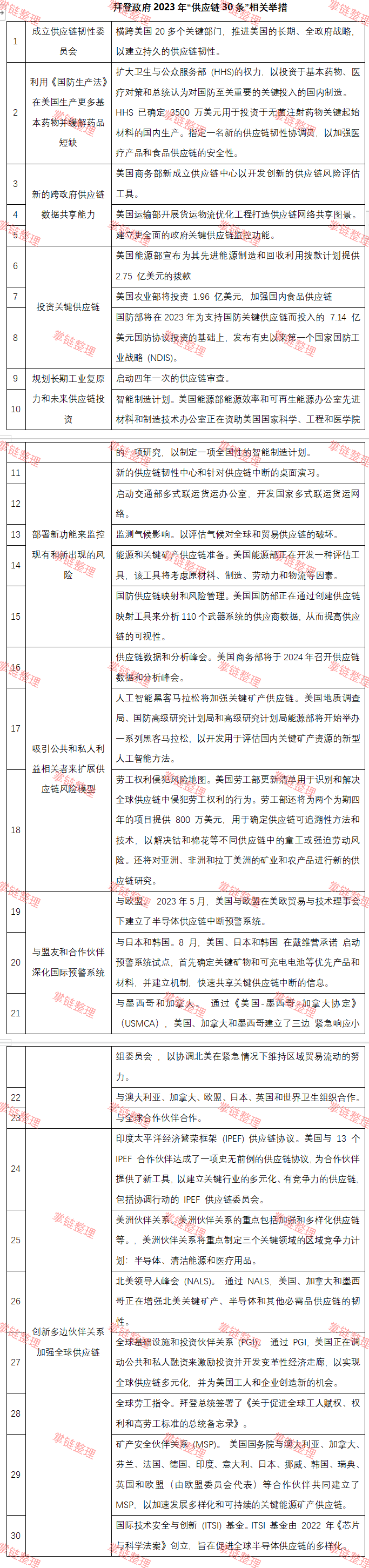 20231127日,拜登倉促宣布成立白宮供應鏈韌性委員會,同時推出供應鏈30將所有的提升供應鏈穩定性措施串聯起來。這些行動涵蓋各種舉措,包括成立供應鏈韌性委員會、利用《國防生產法》促進對國內基本藥物生產的投資以緩解藥品短缺、實施新的跨政府供應鏈數據共享能力,以及促進更容易獲得更實惠、更可靠和關鍵的供應鏈技術。