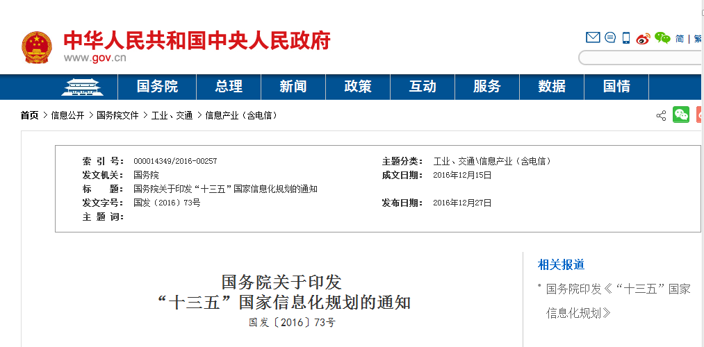 2016年《“十三五”國家信息化規(guī)劃》出臺
