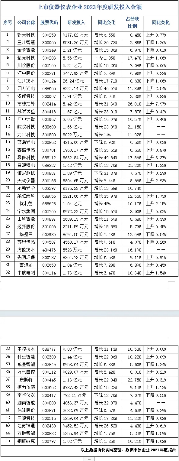 在此背景下,國內儀器儀表企業對研究與開發方面的投入愈發重視,不斷引入創新,提高自身技術先進性以生產出具有競爭力的高質量產品,從而在這場發展機遇中占據有利地位。為方便業內人士深入了解我國儀器儀表企業研發投入現狀,儀表網整理了國內45家上市儀器儀表企業2023年度研發金額、研發投入占比等數據,以饗讀者。