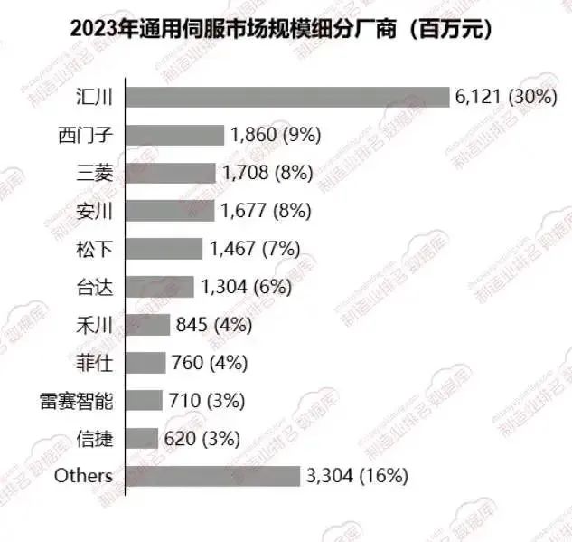 從2023年的銷售額數(shù)據來看,通用伺服市場呈現(xiàn)出較高的集中度,前五家廠商的市場份額超過60%。其中,匯川以30%的市場份額位居第一,領先于西門子、三菱等國際品牌。