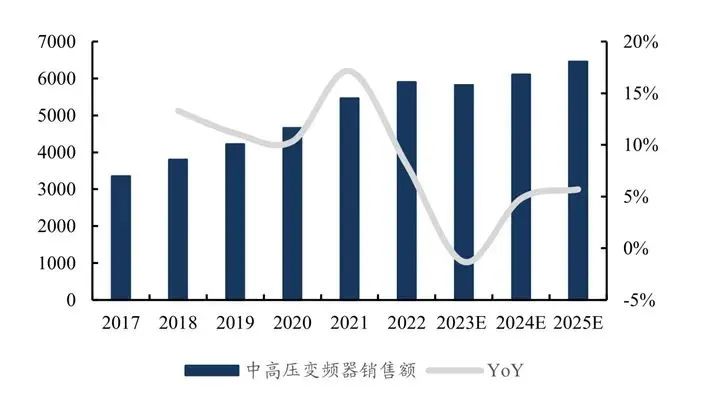 在中高壓變頻器市場中,2020年~2022年,我國中高壓變頻器市場規(guī)模同比增長率分別達到了10%、17%和8%,年復合增長率達到了13%,顯示出強勁的增長動力。