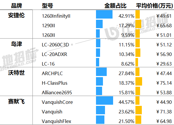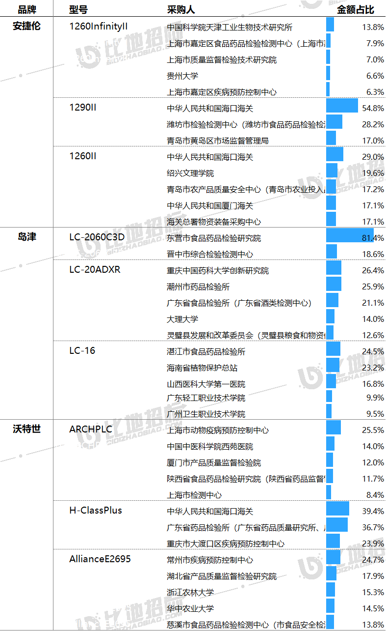 主要采購單位及對應(yīng)中標(biāo)品牌包括:中國科學(xué)院天津工業(yè)生物技術(shù)研究所(安捷倫),上海市動(dòng)物疫病預(yù)防控制中心(沃特世),東營市食品藥品檢驗(yàn)研究院(島津)等。