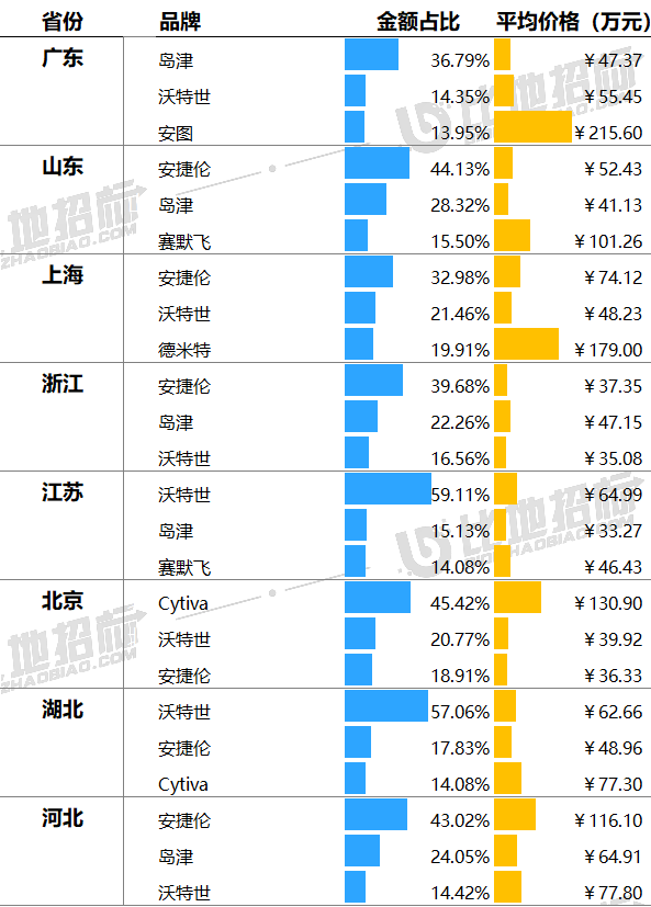 價(jià)格方面,廣西、貴州、河北平均金額相對較高,平均單價(jià)分別為102.87萬元、87.20萬元、77.97萬元;湖南、新疆、寧夏平均金額相對較低,平均單價(jià)分別為29.89萬元、25.42萬元、14.12萬元。