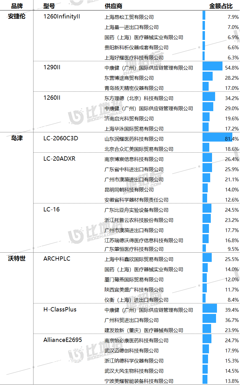 主要供應(yīng)商及對應(yīng)中標(biāo)品牌包括:上海昂松工貿(mào)有限公司(安捷倫),上海中科鑫欣國際貿(mào)易有限公司(沃特世),山東潤耀醫(yī)藥科技有限公司(島津)等。