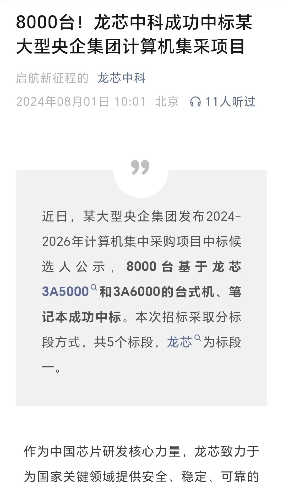 8月1日,龍芯中科在其官方微信公號中曾發(fā)文稱,近日,某大型央企集團發(fā)布2024年-2026年計算機集中采購項目中標候選人公示,8000臺基于龍芯3A5000和3A6000的臺式機、筆記本成功中標。本次招標采取分標段方式,共5個標段,龍芯為標段一。