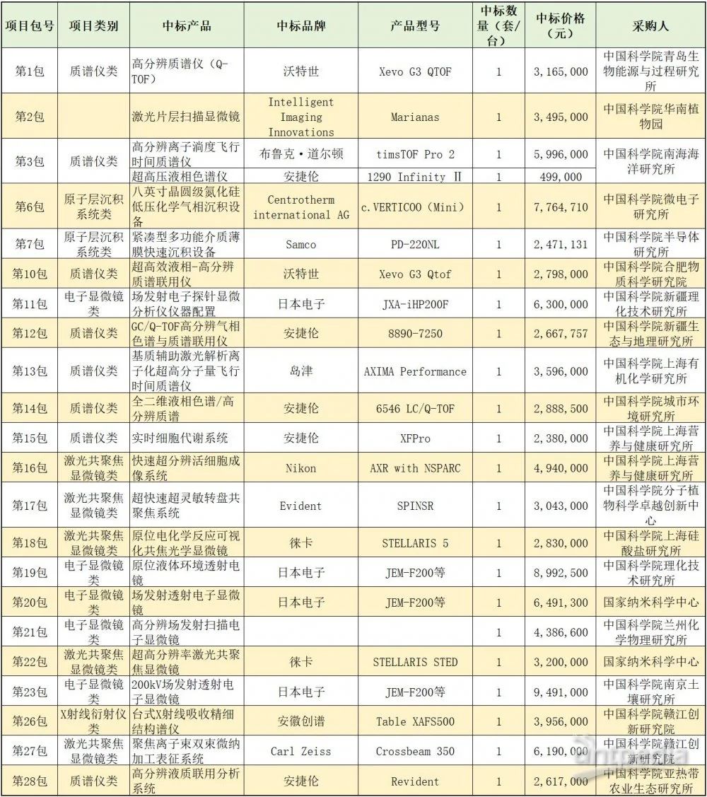 中標的儀器品牌包括國際知名的安捷倫、沃特世、島津、布魯克·道爾頓、日本電子和徠卡等。