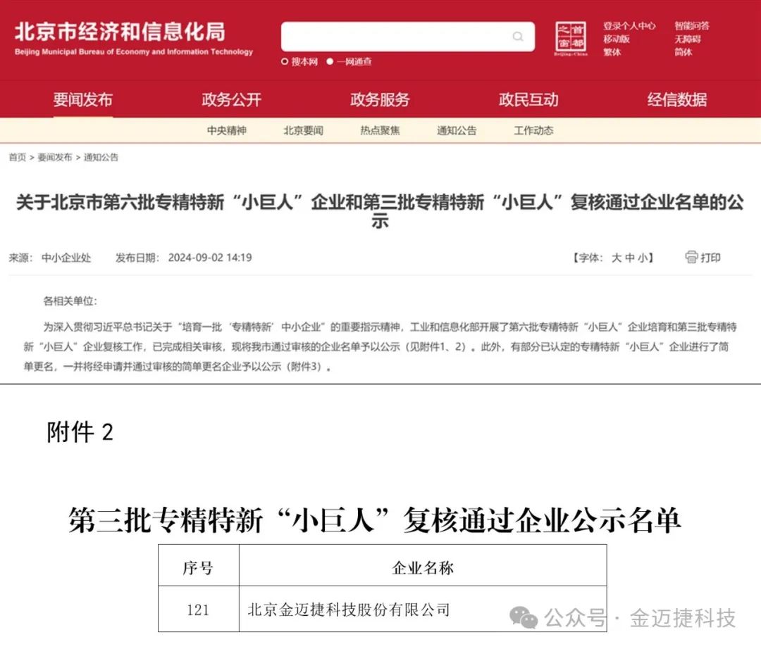 近日,國家工業(yè)和信息化部開展了第三批專精特新“小巨人”企業(yè)復(fù)核和第六批專精特新“小巨人”企業(yè)培育工作。金邁捷于2021年榮獲國家專精特新“小巨人”企業(yè)榮譽(yù)稱號,三年來憑借卓越的創(chuàng)新實力和穩(wěn)健的發(fā)展態(tài)勢,成功通過復(fù)核,再次榮獲國家級專精特新“小巨人”企業(yè)稱號。