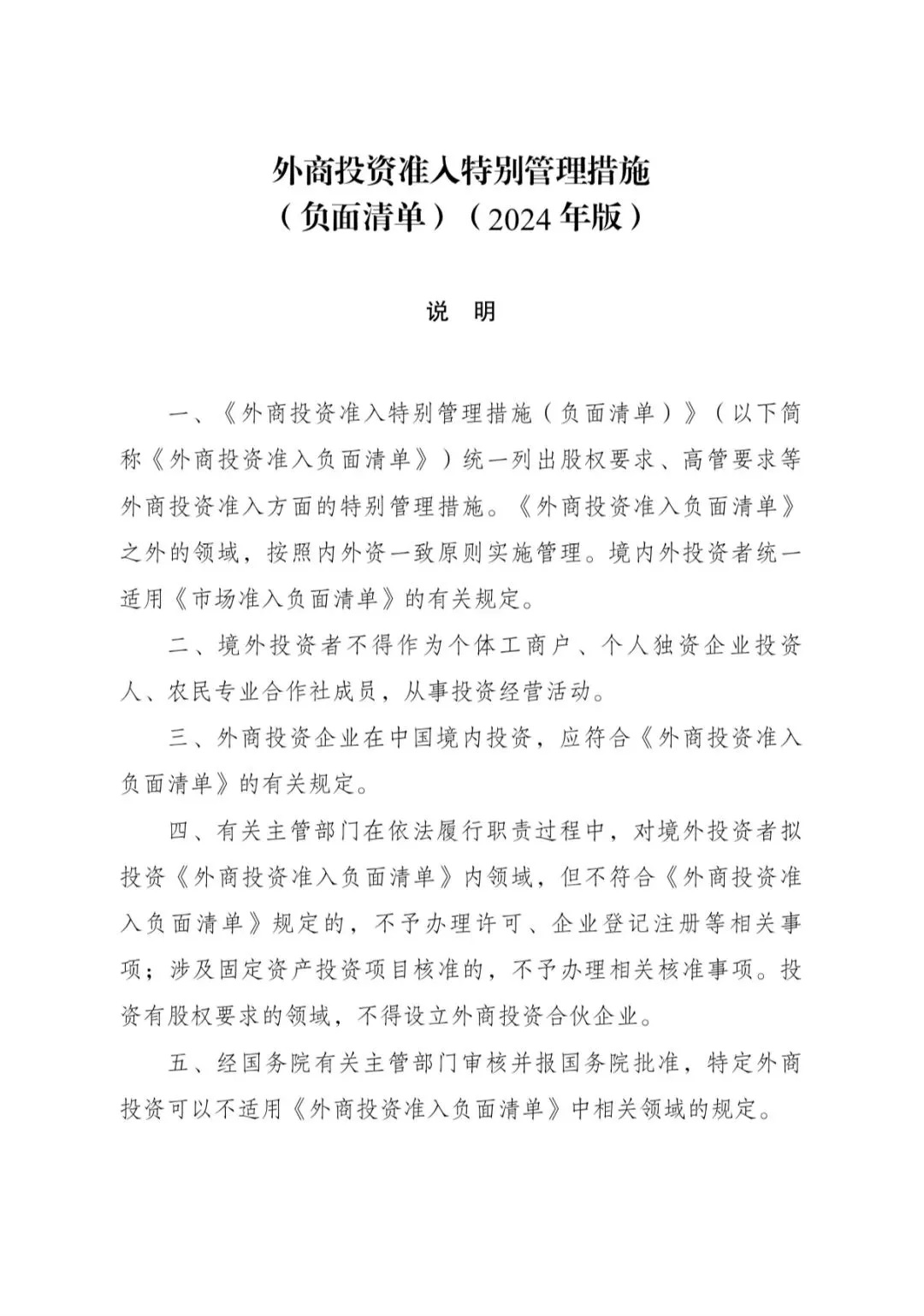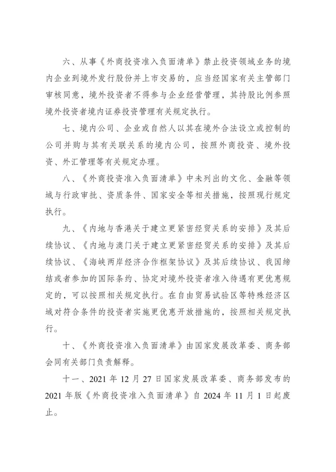 經黨中央、國務院同意,國家發展改革委、商務部于2024年9月8日發布第23號令,全文發布《外商投資準入特別管理措施(負面清單)(2024年版)》,自2024年11月1日起施行。《外商投資準入特別管理措施(負面清單)(2021年版)》同時廢止。
