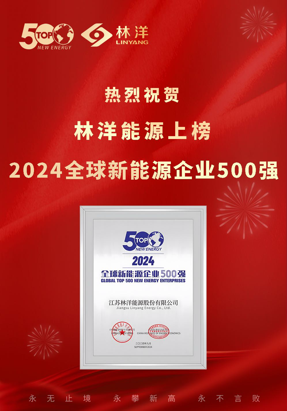 近日,2024新能源與電力市場創(chuàng)新發(fā)展大會暨第十四屆全球新能源企業(yè)500強論壇在山西太原舉行。林洋能源憑借在綠色能源領域的卓越表現(xiàn),榮登2024全球新能源企業(yè)500強,再次體現(xiàn)公司在全球新能源領域的品牌地位與綜合實力。