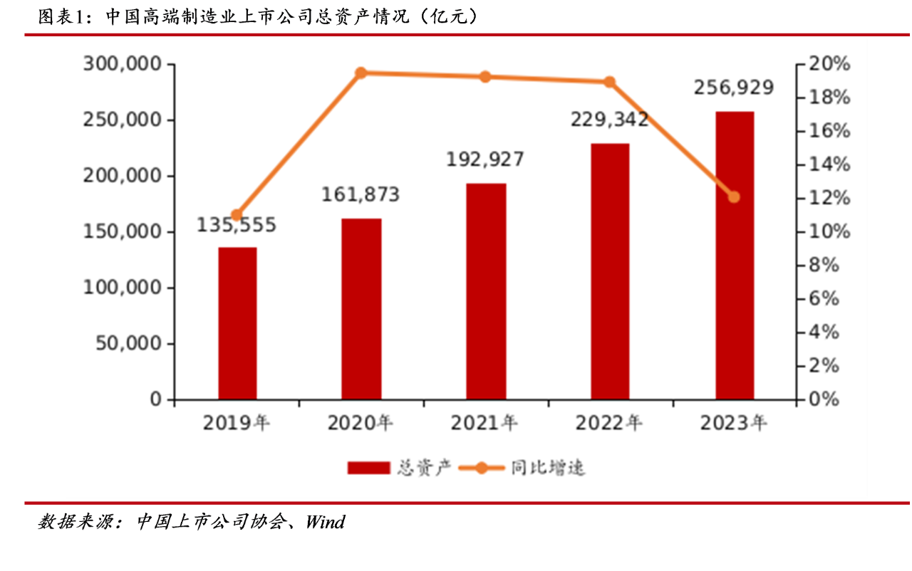 報(bào)告顯示,截至2023年末,高端制造業(yè)上市公司的總資產(chǎn)規(guī)模達(dá)到25.69萬億元,占A股上市公司總資產(chǎn)的比例為6.10%,占比相對較低,這與A股上市公司行業(yè)分布特點(diǎn)有關(guān),銀行、保險(xiǎn)等金融行業(yè)上市公司總資產(chǎn)占據(jù)了A股上市公司總資產(chǎn)的絕大部分。2023年末高端制造業(yè)總資產(chǎn)較2022年末同比增長12.03%,較2019年末增長89.54%,過去5年復(fù)合增長率為17.33%,高于A股整體復(fù)合增長率10.95%,資產(chǎn)規(guī)模快速增長。