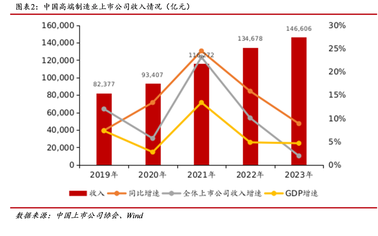過去5年,我國高端制造業(yè)上市公司收入規(guī)模持續(xù)增長,由2019年的8.24萬億元增長至2023年的14.66萬億元,復(fù)合增長率為15.50%,收入增速顯著高于GDP增速,表明高端制造業(yè)上市公司仍處于快速發(fā)展階段,同時仍是拉動我國經(jīng)濟(jì)增長的強(qiáng)勁動力之一。2023年,在復(fù)雜的國際形勢和國內(nèi)外需求下降的背景下,高端制造業(yè)上市公司營業(yè)收入同比增速下降至8.86%,但仍大幅領(lǐng)先于A股上市公司2023年整體收入同比增速1.93%,表現(xiàn)出了強(qiáng)勁的發(fā)展韌性。