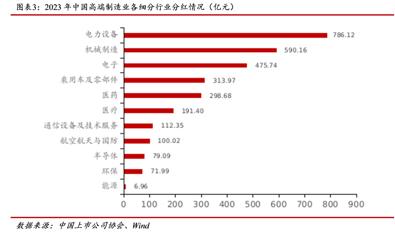 報(bào)告顯示,2023年高端制造業(yè)上市公司分紅總額為3,026.49億元,較2022年度增加83.01億元,2023年度高端制造業(yè)上市公司分紅比例達(dá)到37.91%,較2022年度增加4.52個百分點(diǎn)。分紅最高的細(xì)分行業(yè)為電力設(shè)備行業(yè),分紅總額為786.12億元,機(jī)械制造及電子行業(yè)分紅總額也均超過了450億元,主要原因是電力設(shè)備、機(jī)械制造和電子行業(yè)凈利潤水平在高端制造業(yè)中位居前列。