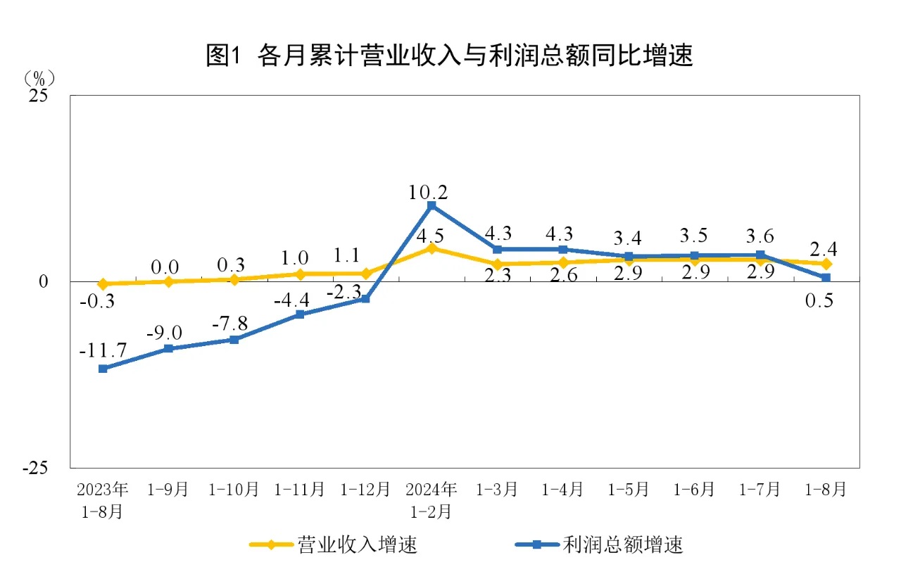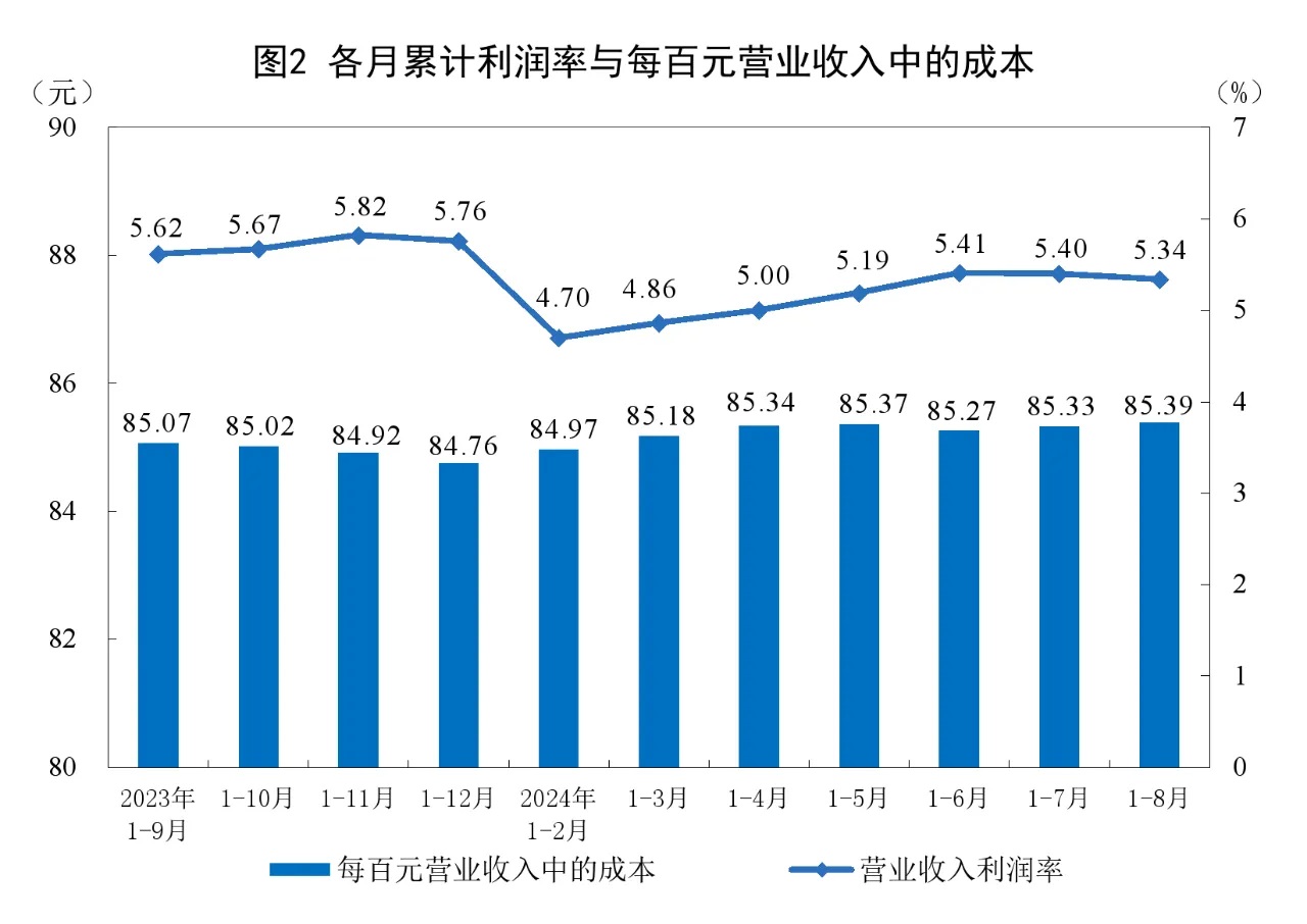1—8月份,規模以上工業企業實現營業收入87.10萬億元,同比增長2.4%;發生營業成本74.38萬億元,增長2.6%;營業收入利潤率為5.34%,同比下降0.10個百分點。
