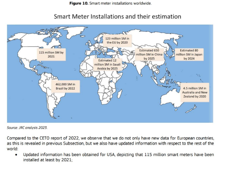 - 全球安裝了超過12億臺智能電表,其中歐洲、澳大利亞和北美是該領域的先驅,僅在歐盟安裝了超過 1.23 億臺智能電表(小編補充:中國迄今已安裝超過6億只智能電表)。