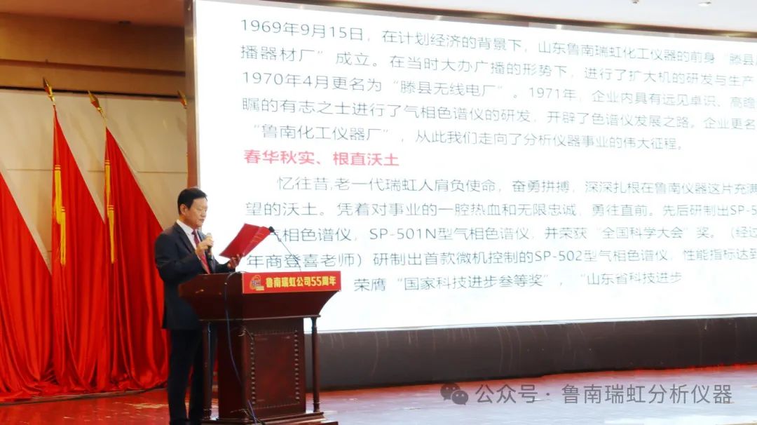 活動由中國科學院空天信息創新研究院研究員馬天軍主持。伴隨著激昂的樂曲,公司董事長孔繁巖登臺致辭,他首先代表公司向現場的各級領導、各界人士,表示熱烈的歡迎和衷心的感謝!他指出山東魯南瑞虹化工儀器有限公司走過了五十五年風雨歷程,在改革開放的巨浪中抓住機遇,以市場需求為導向,積極開拓新領域。特別是面對三年疫情,在經濟環境相對惡劣的情況下,針對市場變化,優化產品,物聯互通,智能運用,贏得了市場,銷量屢創新高。魯南瑞虹以振興國產儀器為己任,以引領色譜技術創新,持續為客戶創造價值為使命。打造中國色譜儀器高端品牌!向百年目標奮進!