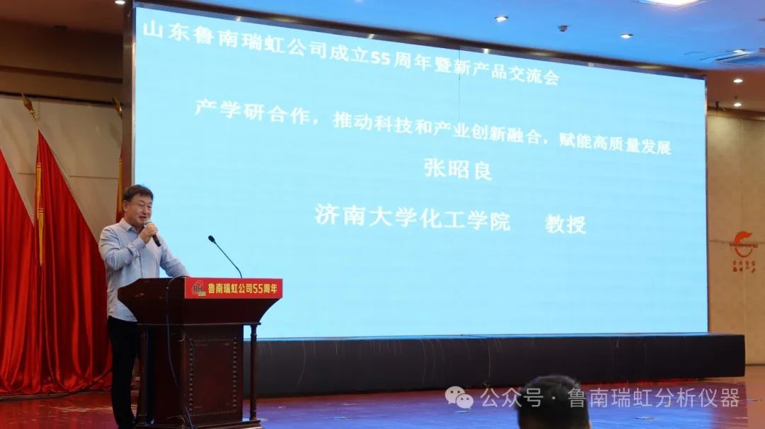 濟南大學化學化工學院副院長張昭良教授登臺致辭。張教授講到他和瑞虹結緣多年,合作了多個項目,使用過瑞虹公司多種型號色譜儀器,同時希望瑞虹公司在未來的道路中專注高端儀器的研發與制造,加強校企合作,為客戶提供更好的色譜產品和服務。