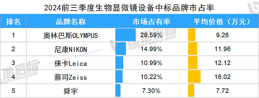 據(jù)比地招標(biāo)網(wǎng)統(tǒng)計(jì):2024年前三季度,生物顯微鏡招投標(biāo)市場(chǎng)有871家采購(gòu)單位,872家中標(biāo)單位,中標(biāo)設(shè)備數(shù)量達(dá)2834臺(tái),中標(biāo)總金額約3.90億元。(產(chǎn)品關(guān)鍵詞:生物顯微鏡、倒置生物顯微鏡、熒光生物顯微鏡等)