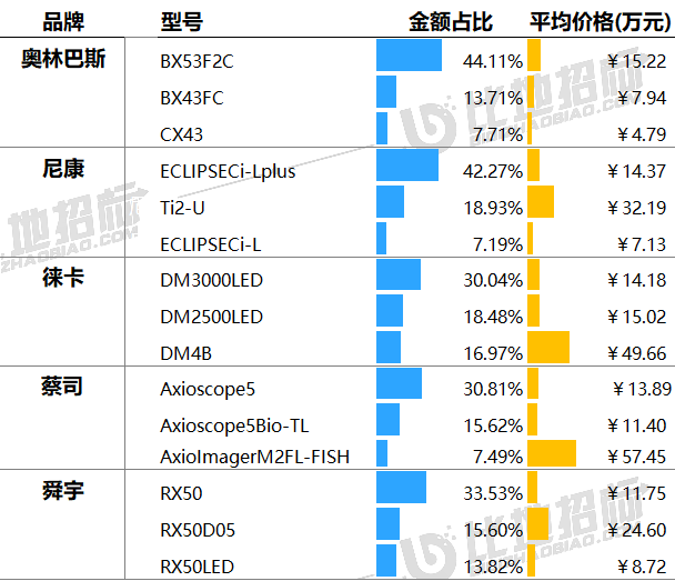 主要品牌型號(hào)金額占比&價(jià)格主流品牌型號(hào)包括,奧林巴斯的BX53F2C、BX43FC、CX43;尼康的ECLIPSECi-Lplus、Ti2-U、ECLIPSECi-L;徠卡的DM3000LED、DM2500LED、DM4B等。